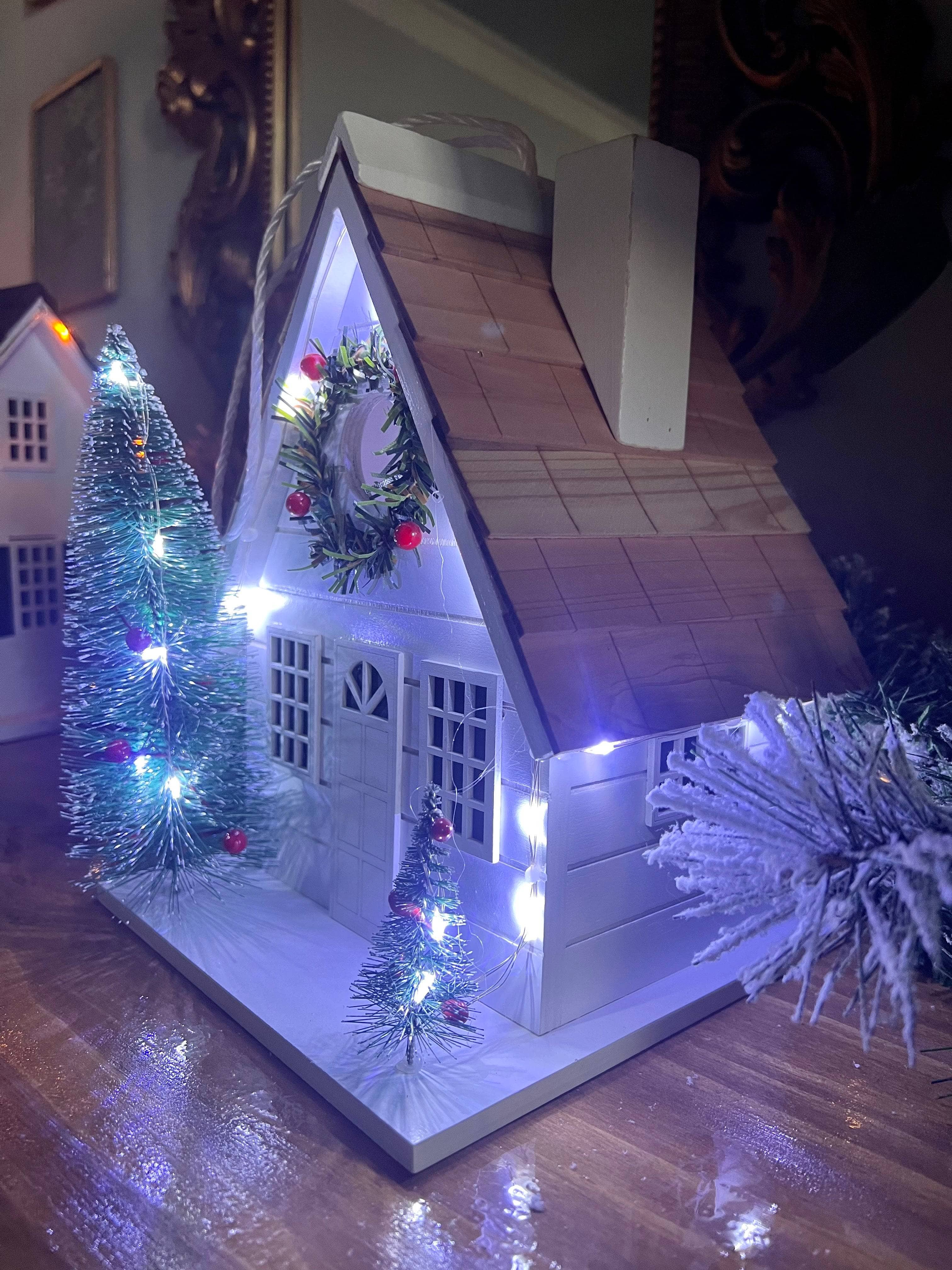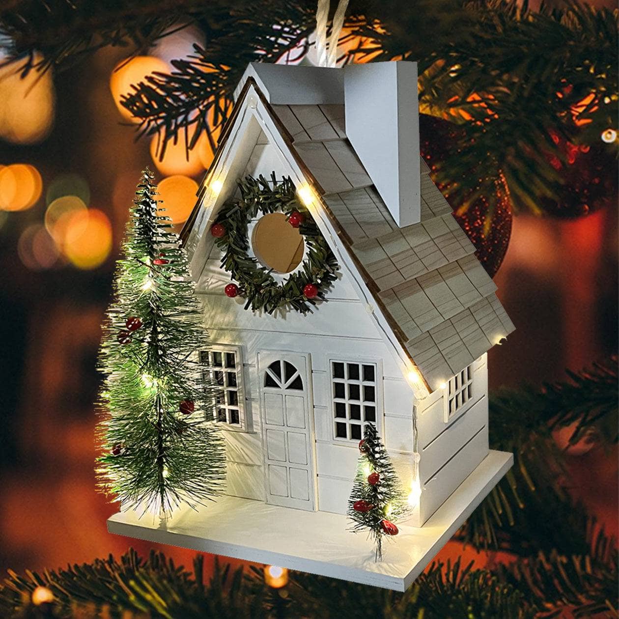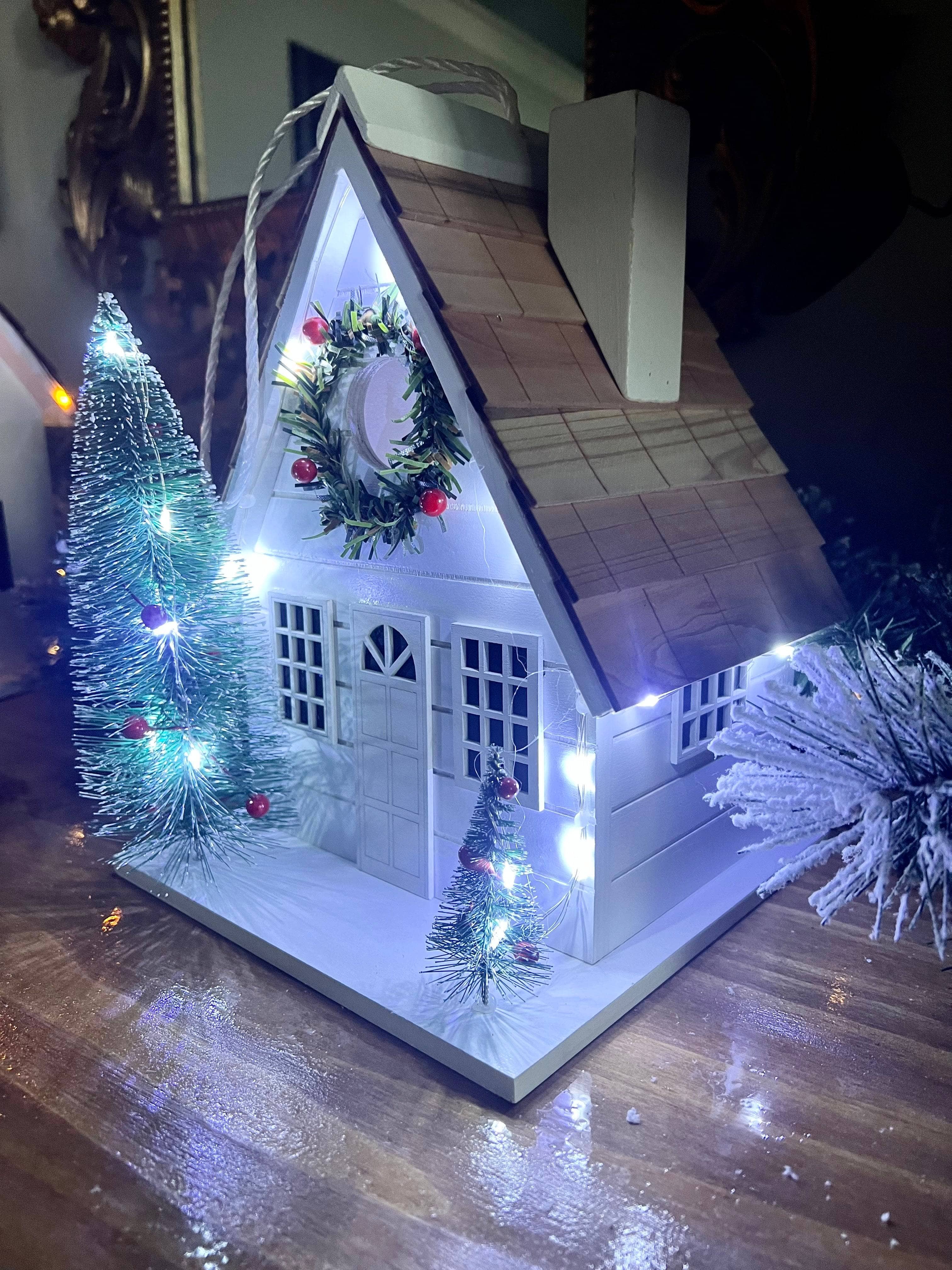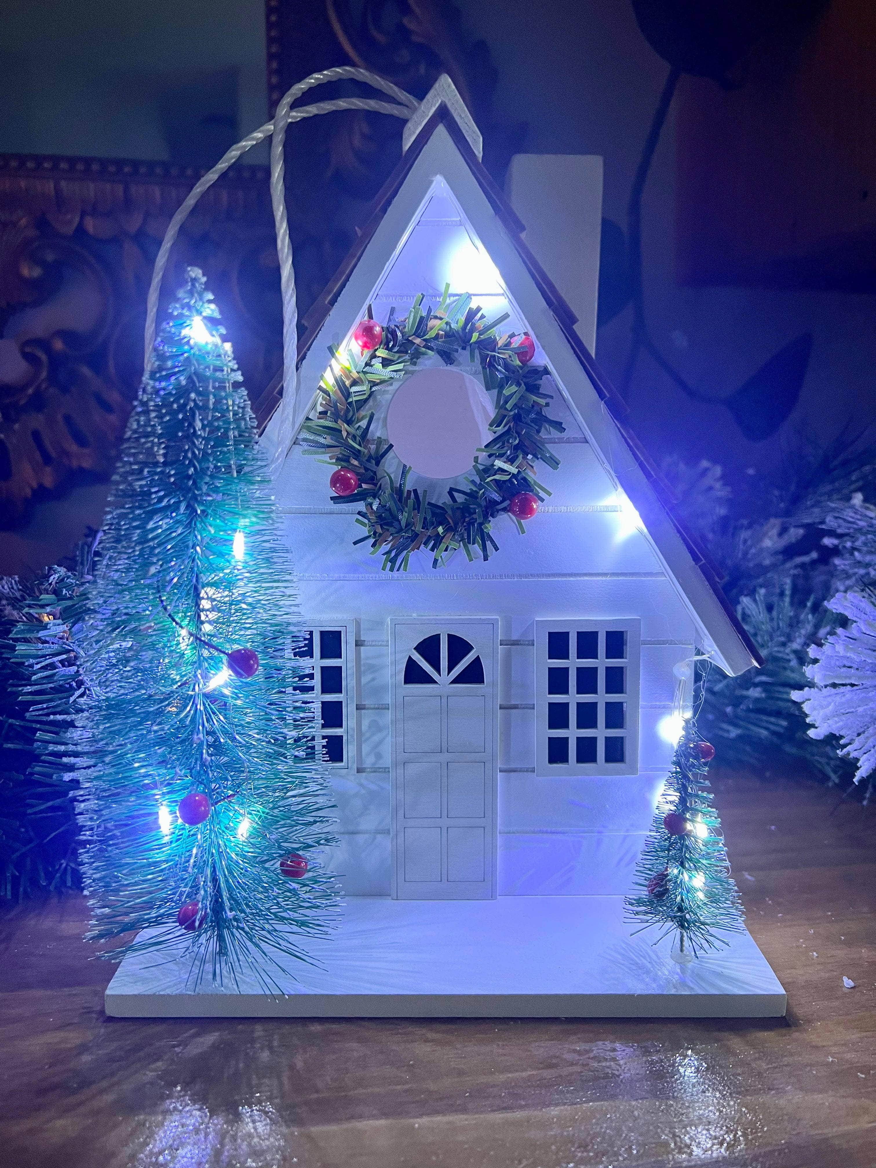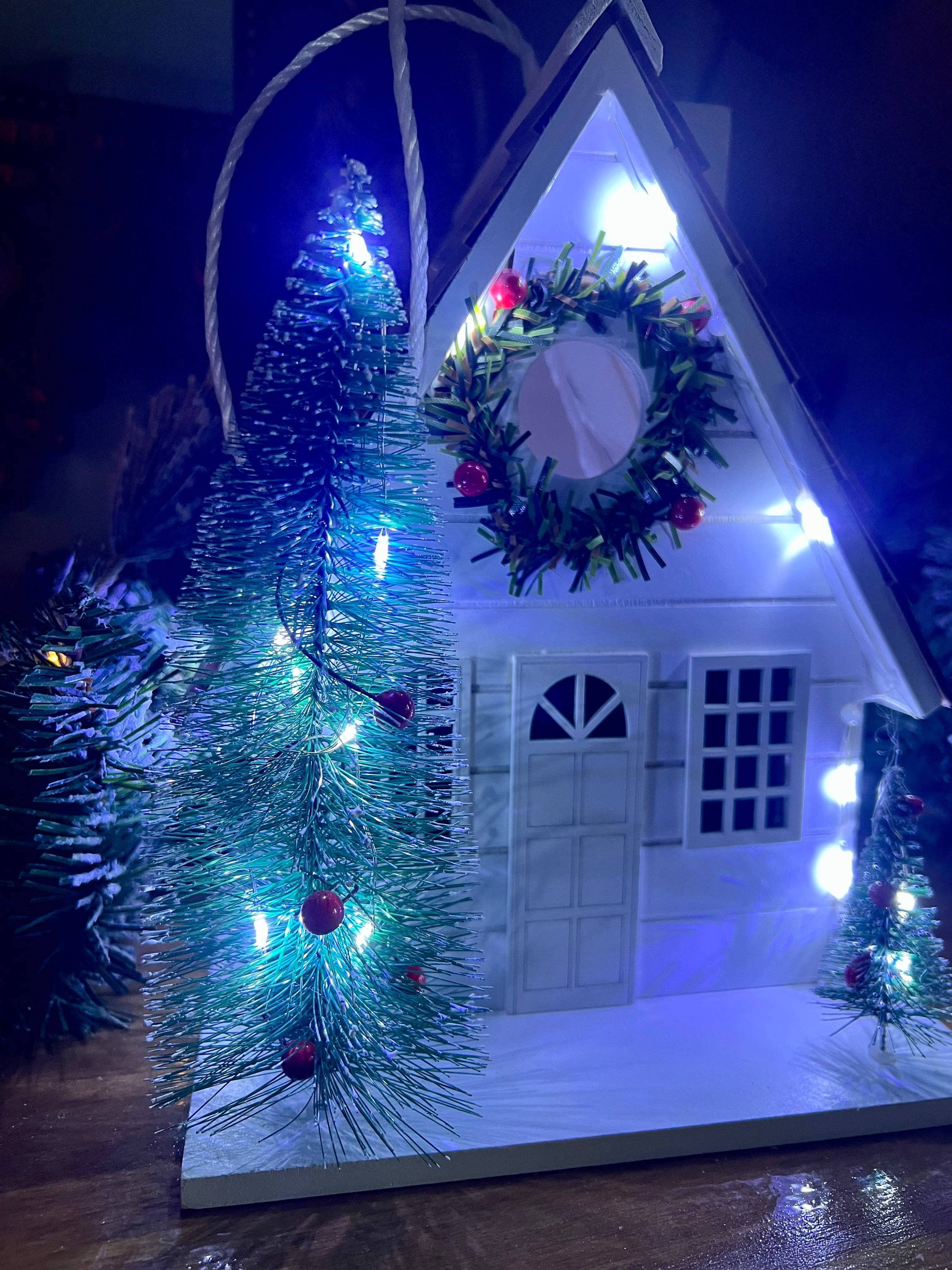 This charming Christmas Chateau birdhouse is decorated with miniature LED Lights, which give the house an inviting warm glow. A Holiday wreath and fir trees adorn the front of the house.