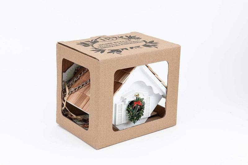 This cheerful holiday hanging birdhouse is designed to accommodate wrens and features a removable wreath detail around the entry hole. Topped with Western Red Cedar shingles and painted with an outdoor paint. Fully functional house has a bottom panel that can be easily removed for yearly cleaning. Sturdy galvanized metal chain.