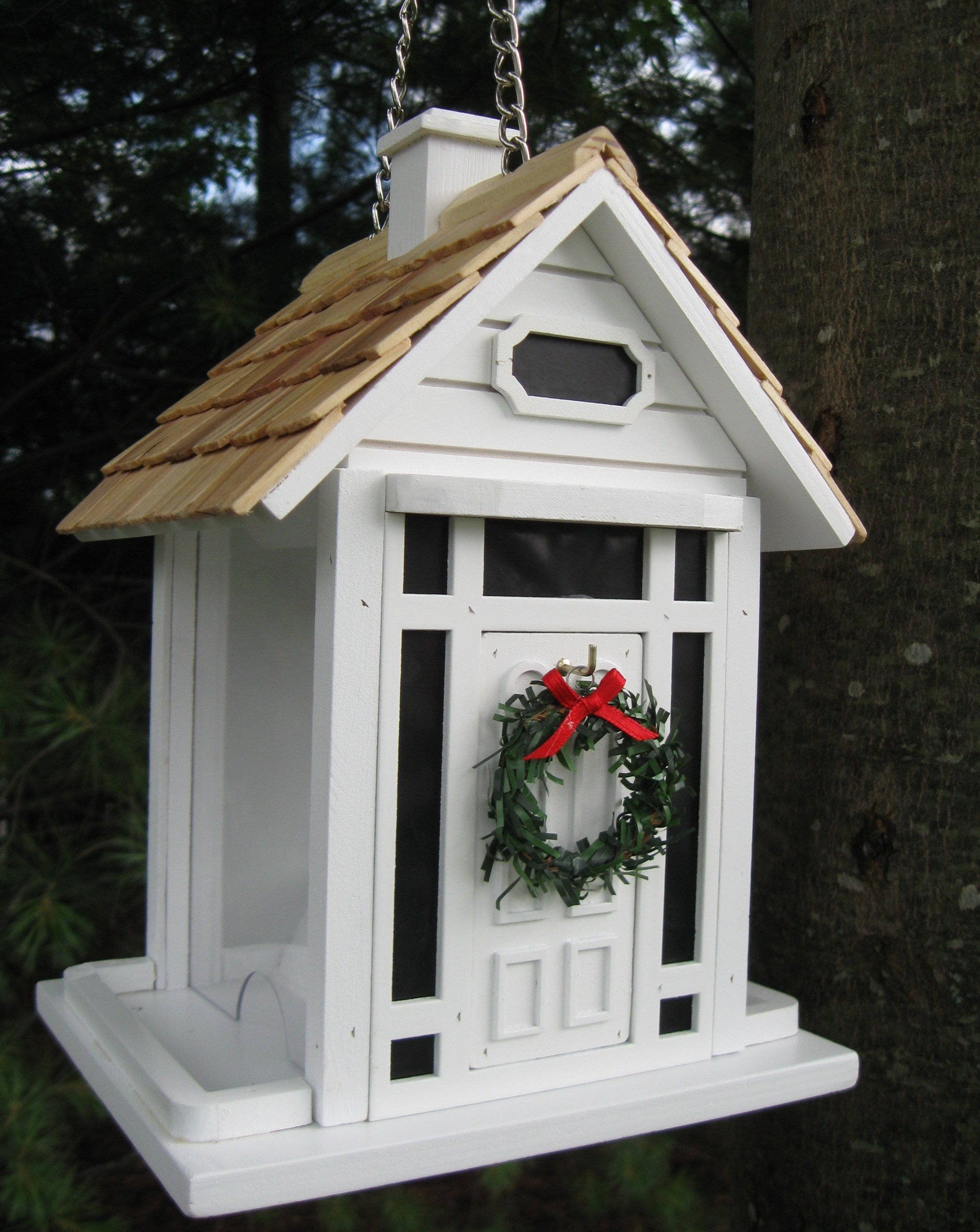 Holiday visitors of both the human and feathered varieties are sure to enjoy the Christmas Cottage Bird Feeder. Our fully functional bird feeder will fit right into any yuletide backyard. Top lifts up to expose ample cavity for seed. Features a removable wreath. Topped off with a pine roof. Hangs from a sturdy galvanized metal chain.