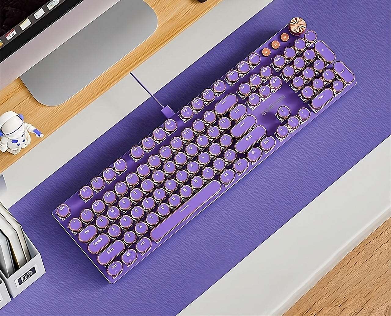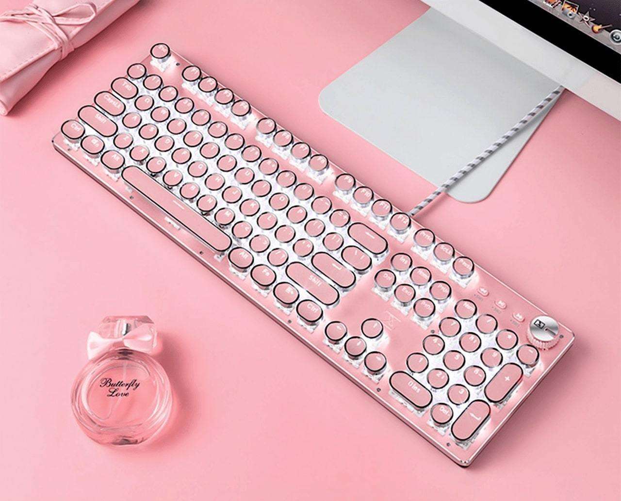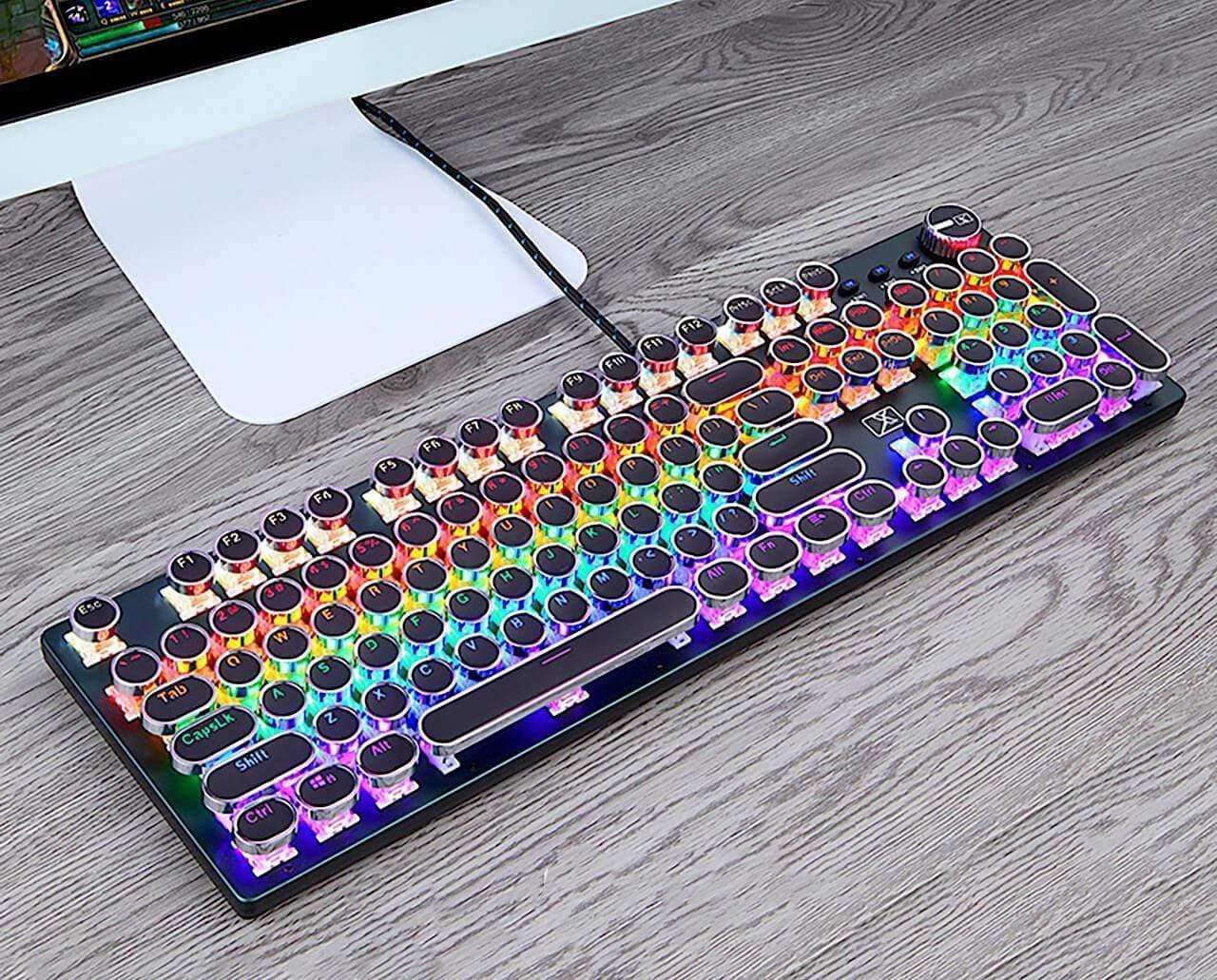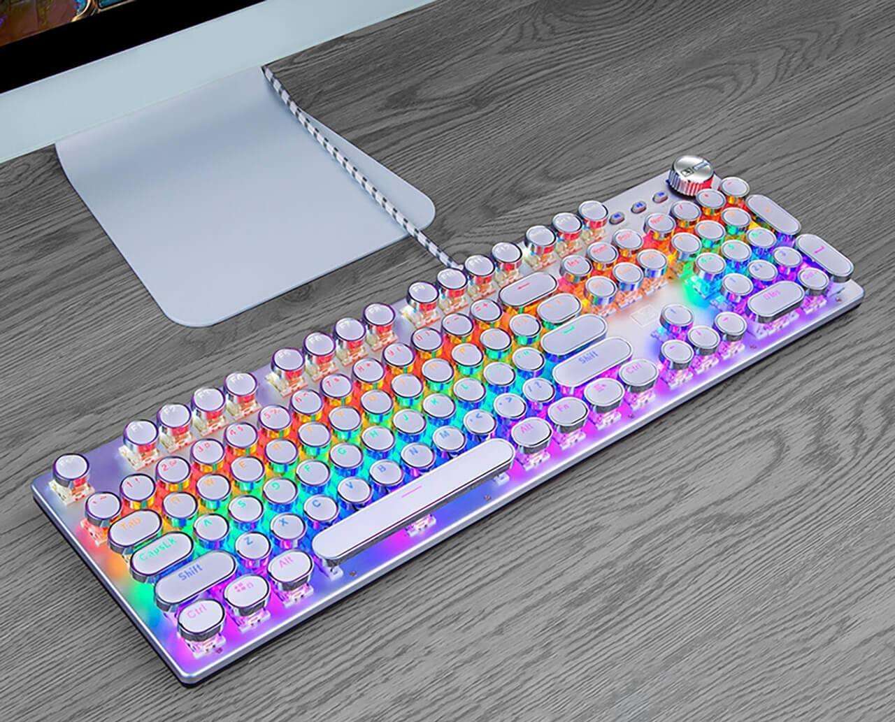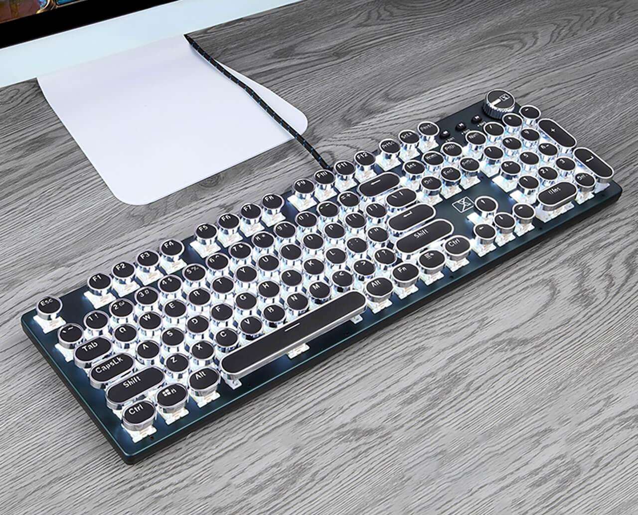 Type away on this luxurious Retro Typewriter Keyboard, crafted with the finest materials! The gorgeous aluminum body and vivid backlights make a stunning combo that will brighten up any room. Shine up your typing experience while easily adjusting the brightness and frequency of the backlighting according to your needs!